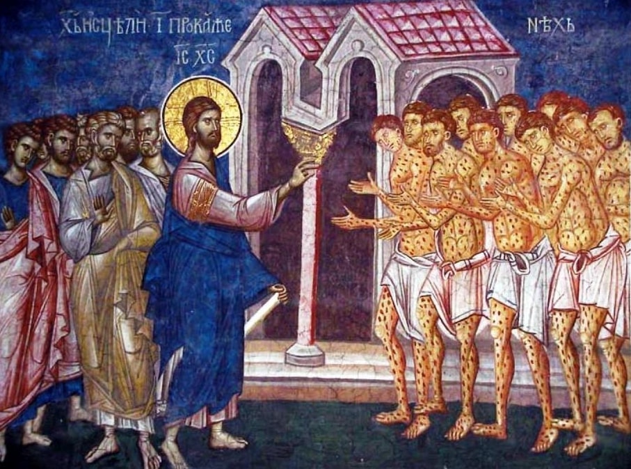 Evanghelia din Duminica a XXIX-a după Rusalii arată că, Mântuitorul Iisus Hristos S-a întâlnit cu zece leproși excluși din comunitate, care stăteau departe de oameni și nu se atingeau de semenii lor, deoarece boala lor era una grea și se putea transmite ușor. Oamenii leproși în Vechiul Testament aveau un regim special de izolare față de oamenii sănătoși, întrucât boala aceasta provoca descompunerea lor treptată, prin căderea unor părți din corpul lor, deși erau încă vii, iar boala era socotită incurabilă, de nevindecat.