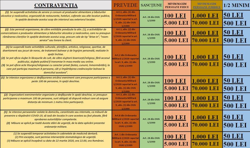 Autoritățile au publicat un document în care sunt precizate sancțiunile care se impun în cazul în care o persoană nu respectă ordonanța militară care a intrat în vigoare duminică de la orele 22.