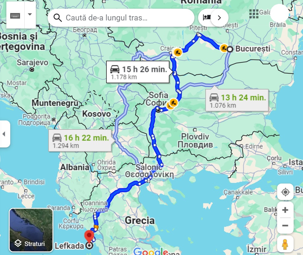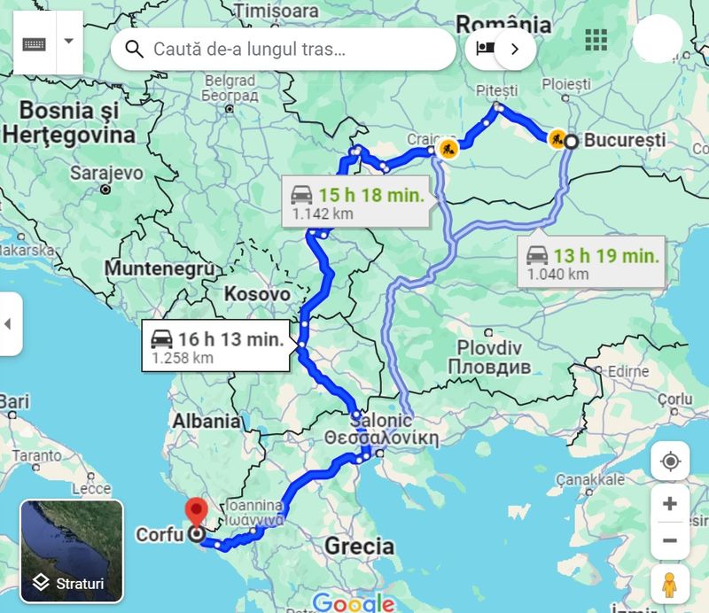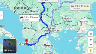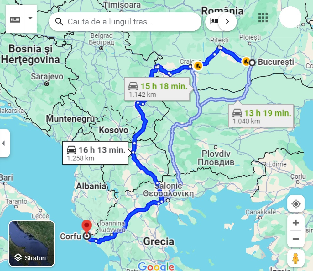 Potrivit estimărilor Google Maps, călătoria cu mașina din București până în Corfu durează 16-17 ore.