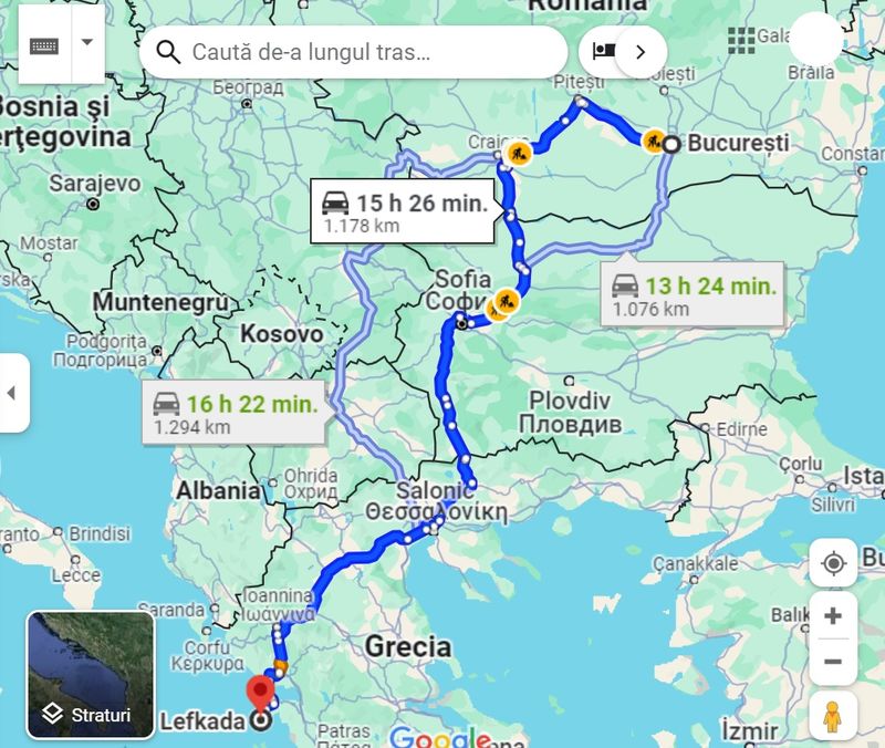 Cel mai scurt drum din România către Lefkada se face tot pe podul Giurgiu-Ruse și are 1100 km.