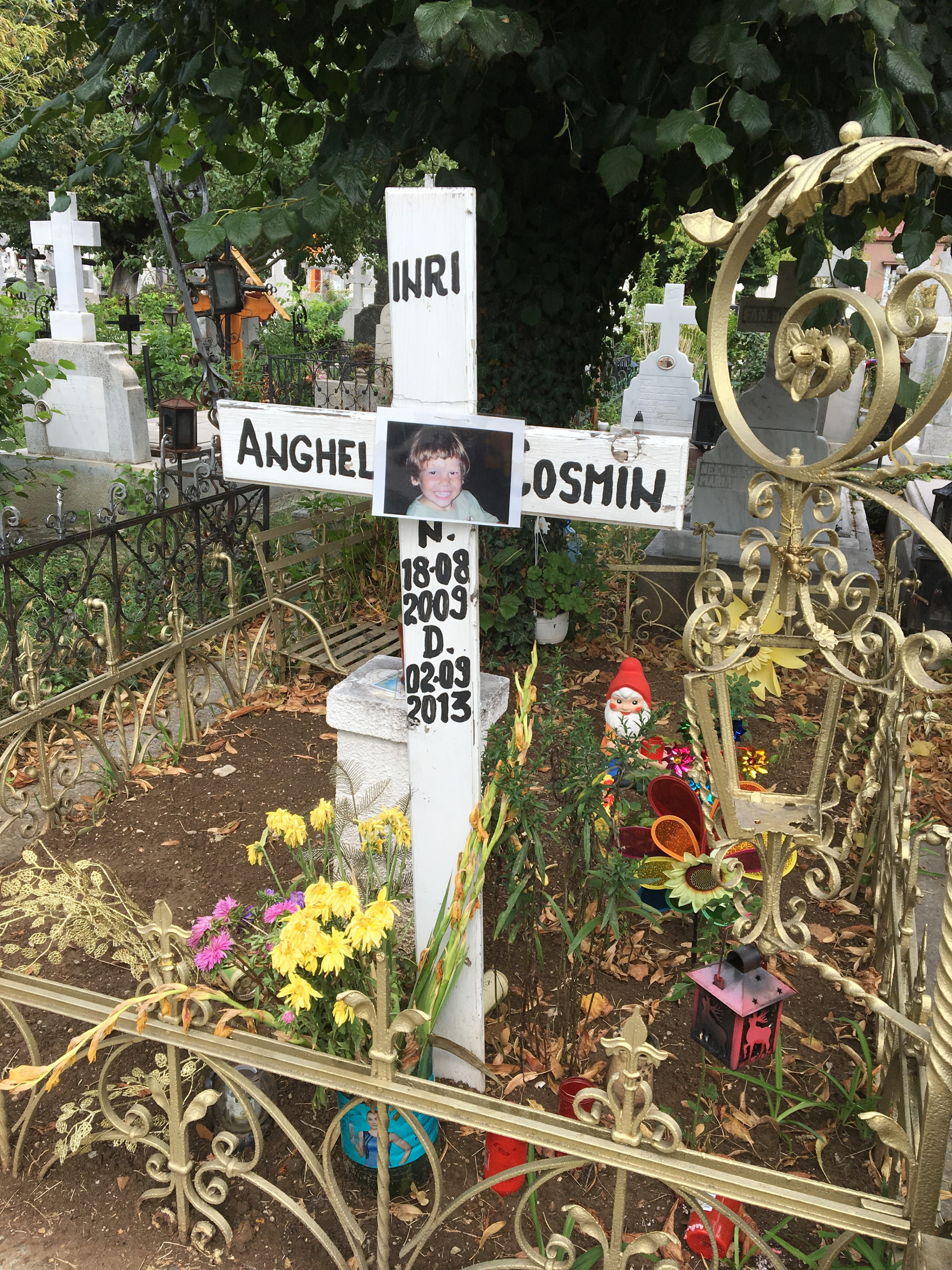 Sotii Anghel au vrut ca mormantul sa aminteasca de personalitatea copilului. Mostenitorul lor era mereu vesel, plin de energie si gata sa faca o nazbatie, asa ca spatiul unde se odihneste pentru eternitate arata ca un loc de joaca impanzit de animale de plus, ornamente colorate si chiar o roata care se invarte cand adie vantul.