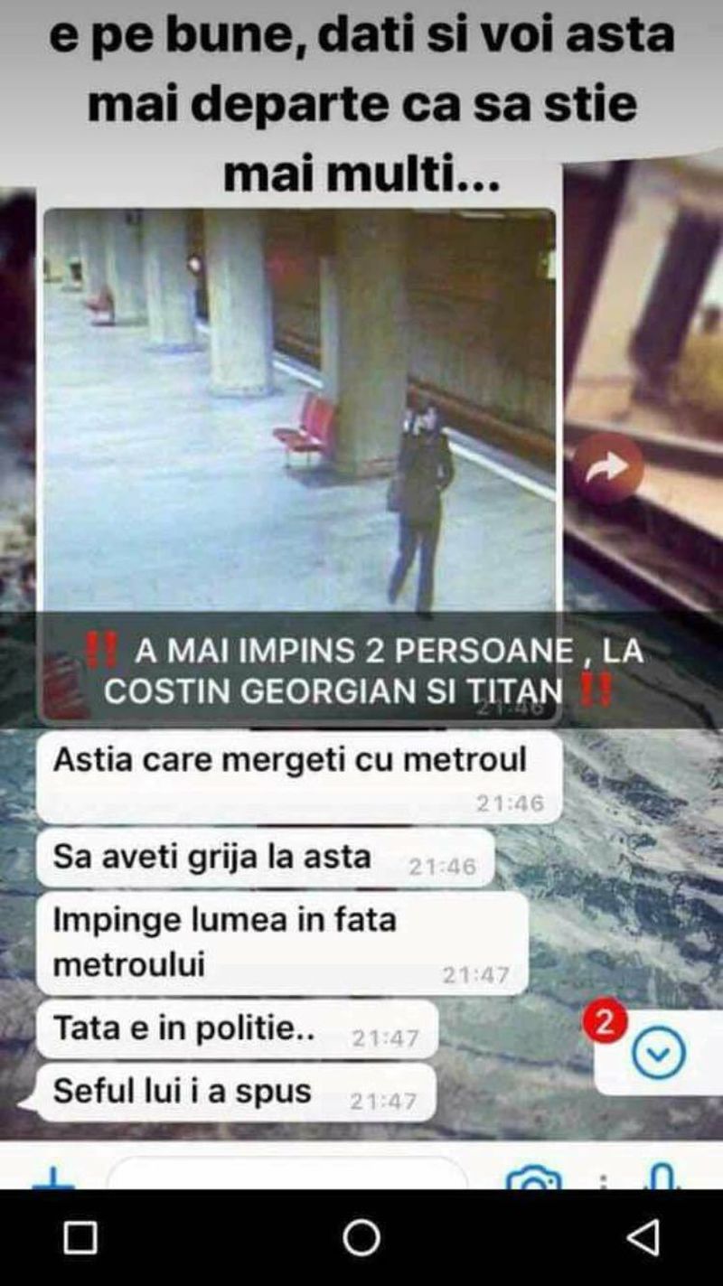 "E pe bune, dati si voi asta mai departe ca sa stie mai multi. A mai impins 2 persoane la Costin Georgian si Titan. Astia care mergeti cu metroul, aveti grija la asta! Impinge lumea in fata metroului. Tata e in politie, seful lui i-a spus", a scris cineva pe o retea de socializare.