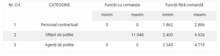 Cele mai mari venituri ajung să le aibă ofițerii de poliție- funcții cu comandă. Ei ajung să câștige până la 11.949 de lei lunar. Personalul contractual, funcții fără comandă, câștigă între 1.862 și 2.886 de lei, conform datelor declarate pentru luna august 2020.