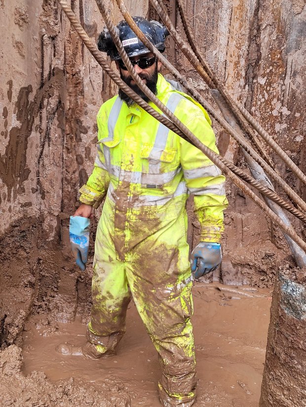 În fotografie se poate observa românul, care este îmbrăcat în echipament, complet, salopetă, bocanci, mănuși, ochelari și cască de protecție, în timp ce stă în noroiul care îi acoperă gleznele.