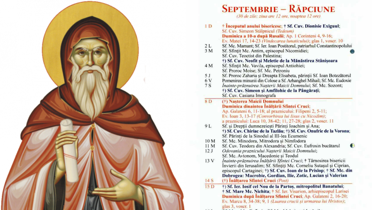 Pe 1 septembrie 2024, Biserica Ortodoxă îl sărbătorește pe Sfântul Cuvios Dionisie Exiguul, precum și începutul anului bisericesc.