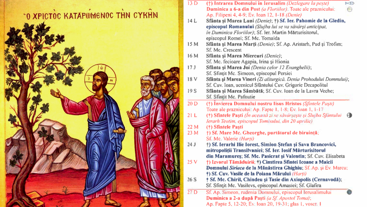 Pe 14 aprilie 2025, în calendarul ortodox, este sărbătoare mare. În ziua de azi, în biserică se citește Denia Smochinul Neroditor, o zi cu semnificații profunde, legate de reflecțiile asupra vieții duhovnicești, mântuirii și disponibilității față de chemarea divină.