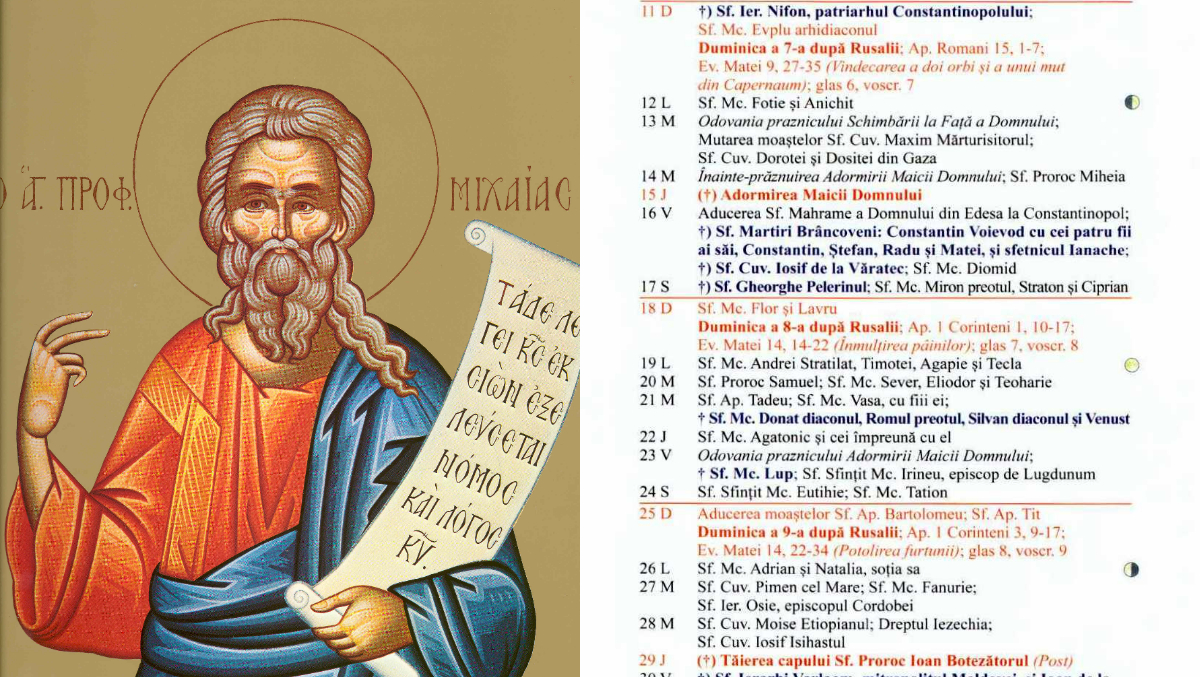 În Calendarul ortodox pe 14 august 2024, în ajunul Adormirii Maicii Domnului, este sărbătorit Sfântul Proroc Miheia.