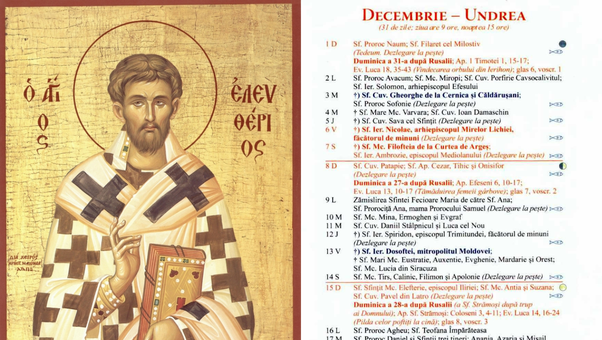 Pe 15 decembrie 2024, în Calendarul ortodox este prăznuit Sfântul Mucenic Elefterie, un exemplu de curaj și credință neclintită în fața persecuțiilor.