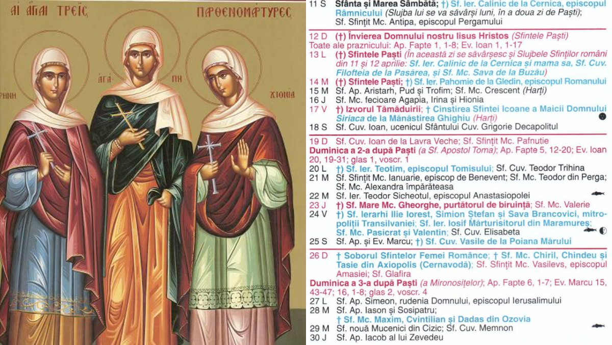 Pe data de 16 aprilie 2026, Biserica Ortodoxă le prăznuiește pe Sfintele Mucenițe Agapi, Hionia și Irina, trei surori care au mărturisit cu prețul vieții credința în Hristos.