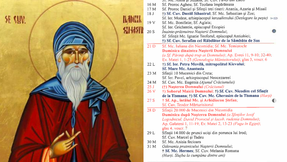 În Calendarul ortodox, ziua de 18 decembrie 2025 este dedicată Sfântului Cuvios Daniil Sihastrul, una dintre cele mai luminoase figuri ale monahismului românesc și un important povățuitor duhovnicesc al Moldovei medievale.