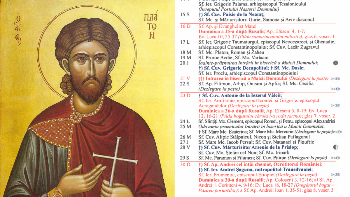 Pe 18 noiembrie 2025, în Calendarul Ortodox sunt prăznuiți Sfântul Mucenic Platon, împreună cu Sfântul Mucenic Roman, diaconul. Această zi este dedicată comemorării curajului martirilor care și-au mărturisit credința în Hristos până la moarte.
