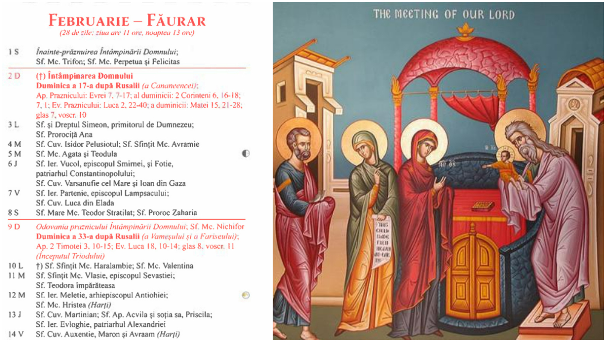Pe 2 februarie 2025, în calendarul ortodox, se sărbătorește Întâmpinarea Domnului, o mare sărbătoare religioasă marcată prin cruce roșie. Aceasta are loc la 40 de zile după Nașterea Mântuitorului și este o zi deosebită în care se celebrează întâlnirea lui Iisus Hristos cu dreptul Simeon și prorocita Ana în Templul din Ierusalim.