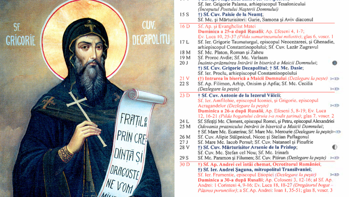 Pe 20 noiembrie 2025, în Ajunul Intrării Maicii Domnului în Biserică, în Calendarul ortodox, este prăznuit Sfântul Grigorie Decapolitul.