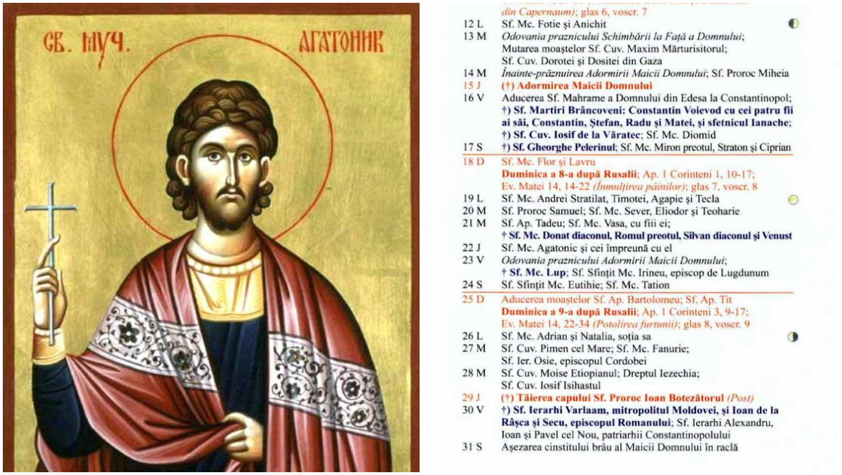 În Calendarul ortodox pe 22 august 2024 este sărbătorit Sfântul Mucenic Agatonic.