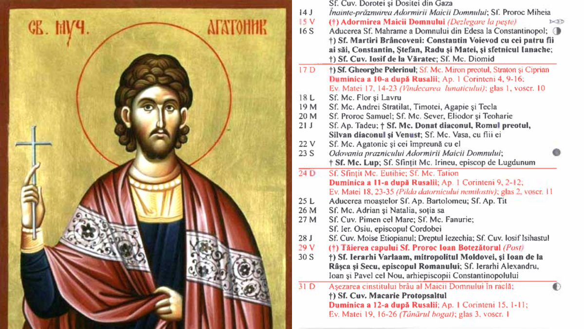 În data de 22 august 2025, Calendarul ortodox îi pomenește pe Sfântul Mucenic Agatonic și pe cei împreună cu el. Această zi este dedicată cinstirii unui grup de martiri din primele veacuri ale creștinismului, care au suferit moarte martirică pentru credința lor în Hristos.
