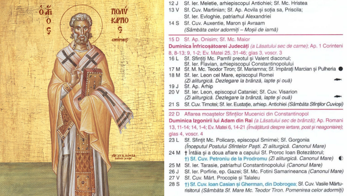 Pe 23 februarie 2026, în Calendarul ortodox este prăznuit Sfântul Policarp al Smirnei, episcop și mucenic al Bisericii primare, unul dintre cei mai importanți Părinți Apostolici.