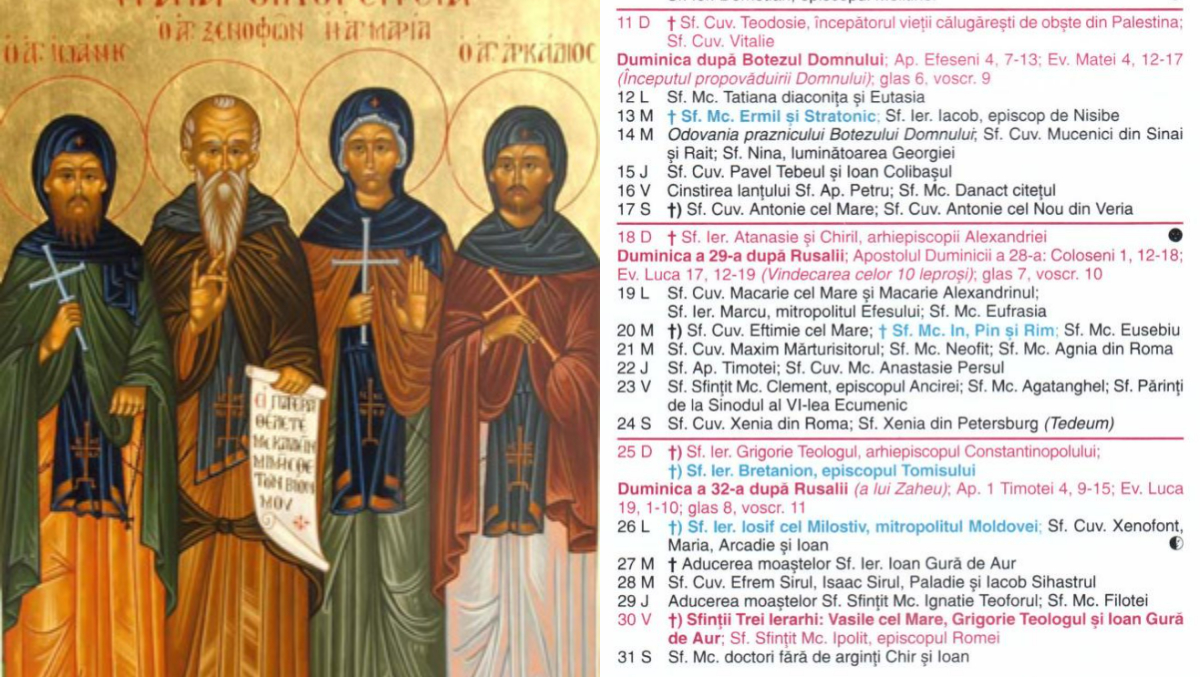În Calendarul ortodox, data de 26 ianuarie 2026 este dedicată pomenirii Sfinților Cuvioși Xenofont, Maria și fiii lor, Ioan și Arcadie, modele de familie creștină, credință statornică și ascultare de voia lui Dumnezeu.