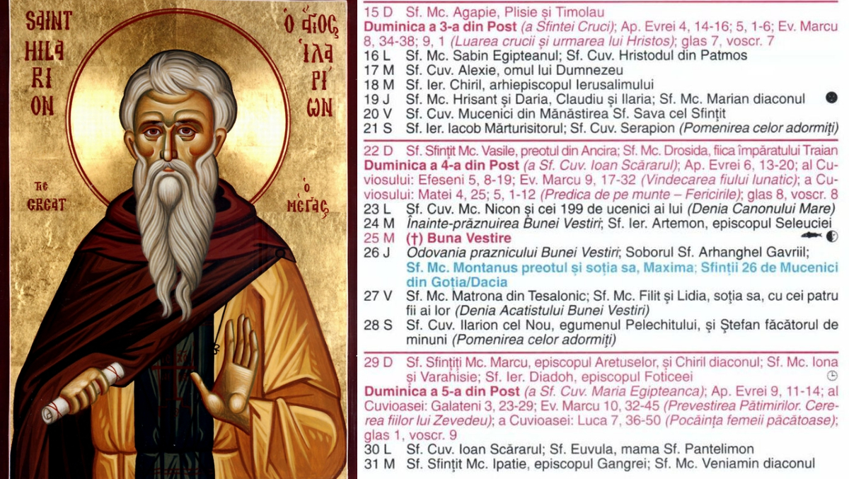 În Calendarul ortodox, data de 28 martie 2026 este dedicată pomenirii Cuviosului Ilarion, starețul mănăstirii Pelechit din Helespont, alături de alți monahi care au suferit pentru apărarea sfintelor icoane.