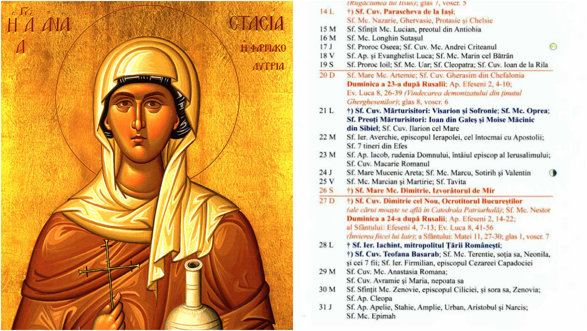 Pe 29 octombrie 2024, în calendarul ortodox este pomenită Sfânta Muceniță Anastasia Romana, o figură emblematică a credinței creștine din perioada persecuțiilor împotriva creștinilor, cunoscută pentru viața sa plină de devoțiune și martiriul suferit pentru credința sa în Hristos.