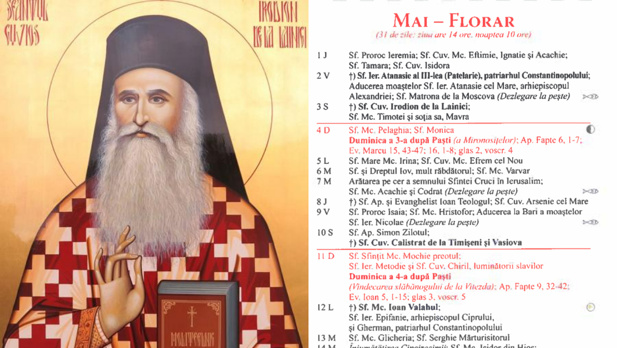 Pe data de 3 mai 2025, în Calendarul ortodox este prăznuit Sfântul Cuvios Irodion de la Lainici, un mare duhovnic și luminător al monahismului românesc din secolul al XIX-lea. Această zi este dedicată pomenirii trecerii sale la cele veșnice, care a avut loc la 3 mai 1900.