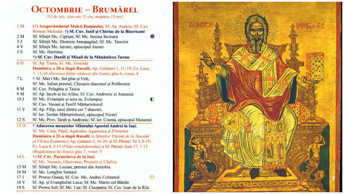 Pe 3 octombrie 2024, în calendarul orto dox, este prăznuit Sfântul Dionisie Areopagitul. Acesta este cunoscut ca fiind unul dintre primii convertiți la creștinism în Atena și un teolog remarcabil, ale cărui scrieri au influențat gândirea creștină și au adus contribuții semnificative în înțelegerea ierarhiilor îngerești.