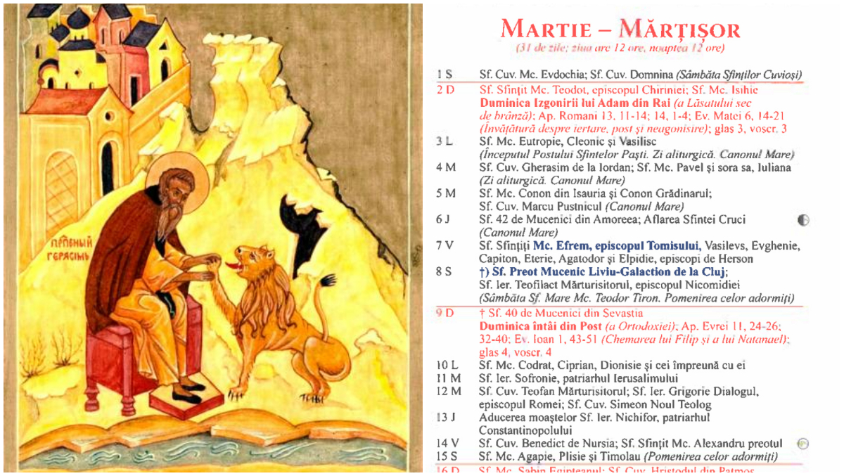 Pe 4 martie 2025, în Calendarul ortodox este prăznuit pe Sfântul Gherasim de la Iordan, un sfânt cunoscut pentru viața sa ascetică și pentru legătura sa specială cu natura și animalele. Sfântul Gherasim a trăit în secolul al VII-lea și s-a retras în pustia Tebaidei, unde a fondat un așezământ monahal ce dăinuiește până în zilele noastre.
