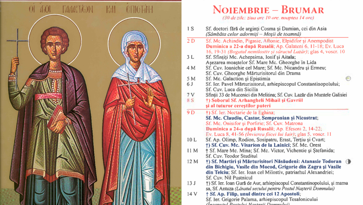 Pe 5 noiembrie, Biserica Ortodoxă îi pomenește pe Sfinții Mucenici Galaction și Epistimia, doi tineri care au ales să-și dedice viața lui Hristos în ciuda presiunilor lumii și a pericolelor persecuției creștinilor.