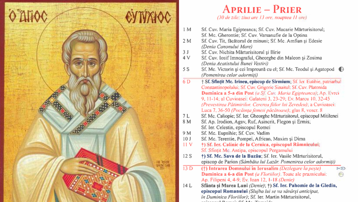 Pe 6 aprilie 2025, în Calendarul Ortodox, este prăznuit Sfântul Eutihie, Patriarhul Constantinopolului. Această sărbătoare îl omagiază pe unul dintre cei mai mari ierarhi ai Bisericii Ortodoxe, care a trăit în perioada Imperiului Bizantin și care s-a remarcat nu doar prin înțelepciunea și evlavia sa, ci și prin curajul cu care a apărat adevărul credinței ortodoxe.