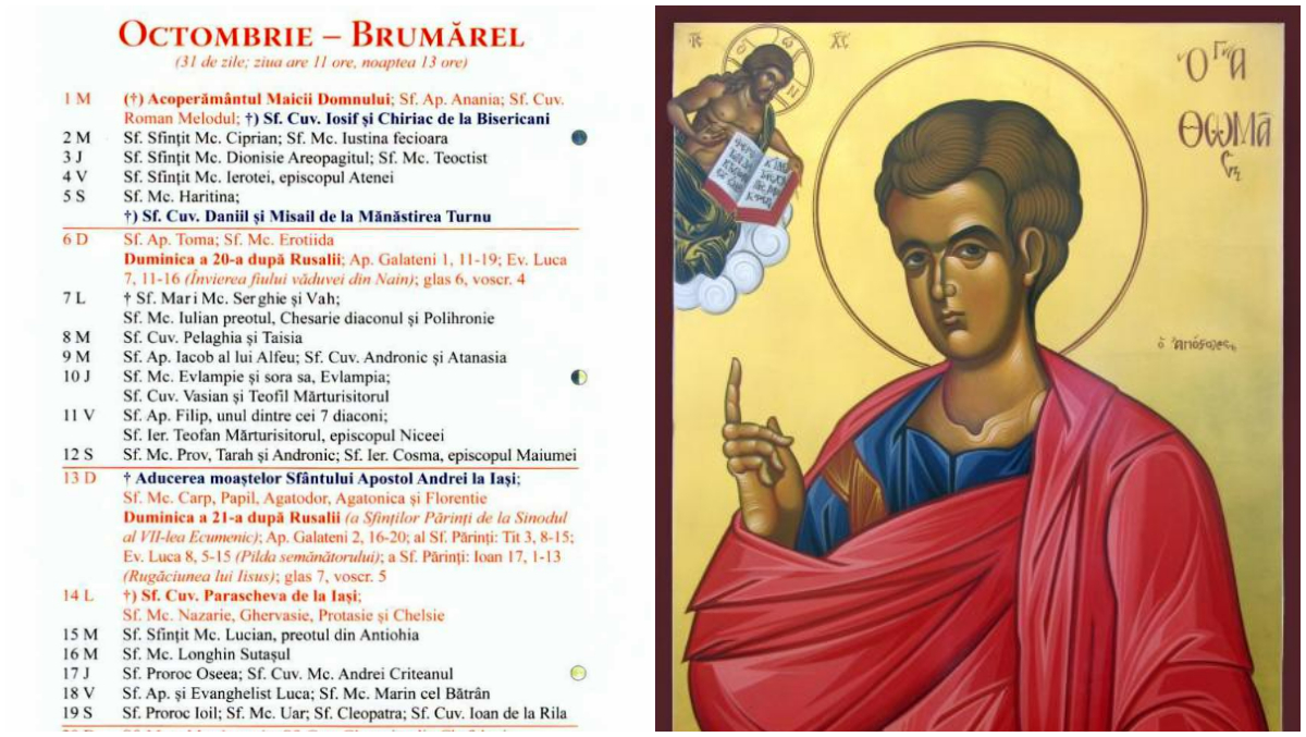 Pe data de 6 octombrie 2024 în Calendarul ortodox este prăznuit Sfântul Apostol Toma, unul dintre cei 12 Apostoli ai Mântuitorului Hristos.