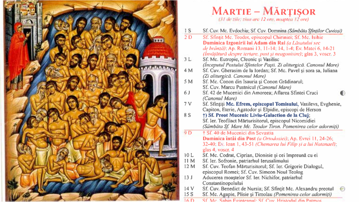 Pe data de 9 martie 2025, în Calendarul ortodox sunt prăznuiți Sfinții 40 de Mucenici din Sevastia, un grup de soldați care și-au dat viața pentru credința în Hristos, refuzând să se lepede de creștinism.