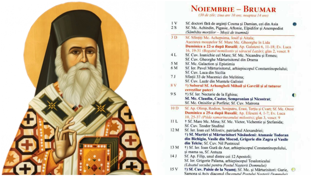 Pe 9 noiembrie, în Calendarul ortodox este prăznuit Sfântul Nectarie Taumaturgul, un sfânt deosebit, cunoscut pentru viața sa de nevoință, harul vindecător și minunile săvârșite. Această zi este o ocazie de a-i adresa rugăciuni de mulțumire și de ajutor pentru cei aflați în suferință, în special pentru cei care se confruntă cu boli grave, având în vedere faima sa de vindecător de cancer și alte afecțiuni dificile.
