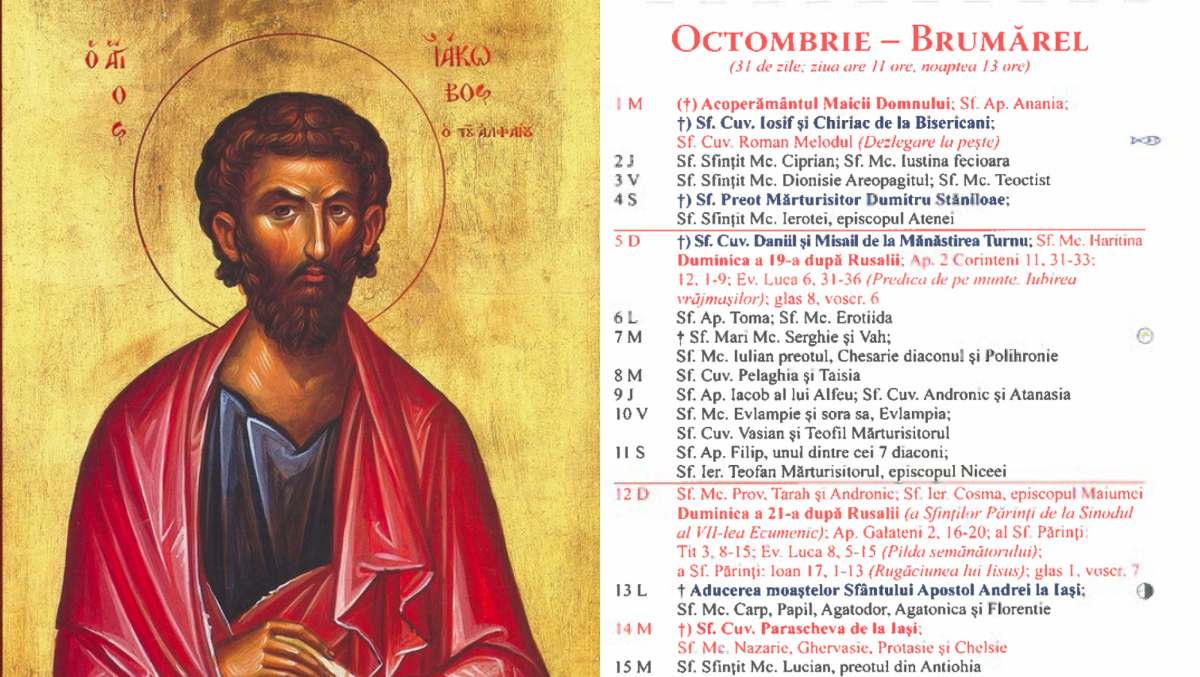 Pe data de 9 octombrie 2025, Calendarul ortodox îl prăznuiește pe Sfântul Apostol Iacob al lui Alfeu, unul dintre cei doisprezece Apostoli ai Mântuitorului Iisus Hristos.
