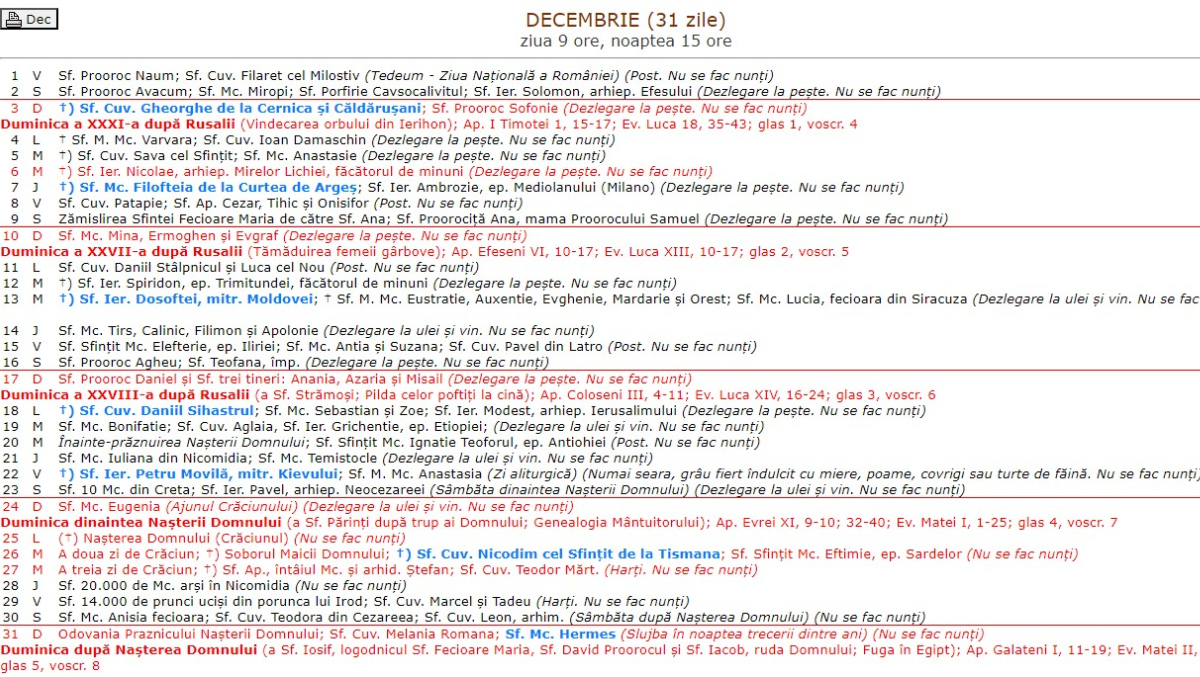 Calendar ortodox decembrie 2023: