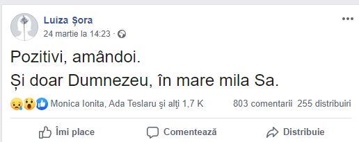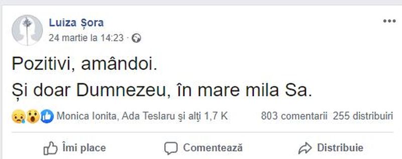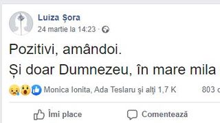 Mesaj pe care cei mai mulți l-au interpretat, în contextul actual al epidemiei de coronavirus, că Luiza și Mihai Șora ar fi ieșit pozitivi la testarea pentru COVID-19.