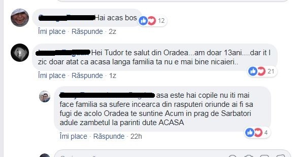 Cel mai impresionant mesaj este cel al unui băiat care pare că nu-l cunoaşte pe Tudor: ”Hei, Tudor. Te salut din Oradea, am doar 13 ani, dar îţi zic doar atât: ca acasă, lângă familia ta, nu e mai bine nicăieri”