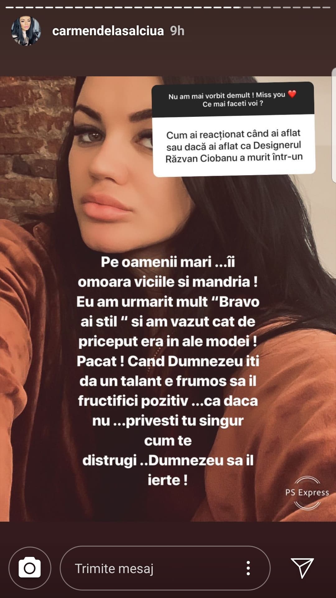 "Pe oamenii mari îi omoară viciile și mândria. Eu am urmărit mult "Bravo, ai stil" și am văzut cât de priceput era în ale modei. Păcat! Când Dumnezeu îți dă un talent e frumos să îl fructifici pozitiv, că dacă nu privești tu singur cum te distrugi... Dumnezeu să-l ierte!", a răspuns Carmen de la Sălciua legat de moartea lui Răzvan Ciobanu.