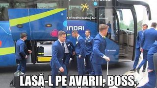 O alta gluma reusita este legata de sosirea echipei nationale in Franta. O poza cu tricolorii langa autocarul nationalei a starnit hohote de ras.
