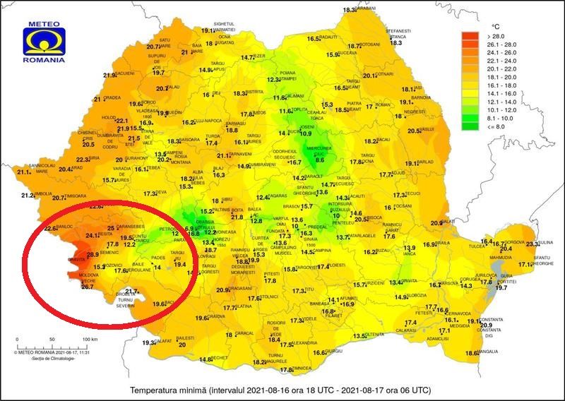 În dimineața zilei de marți, 17 august, s-a înregistrat una dintre cele mai ridicate temperaturi minime din timpul nopții de când există date meteo în România: la Oravița, în Banat, au fost +28,9 C. La ora 8 erau +30 de grade la Oravița și Reșița.