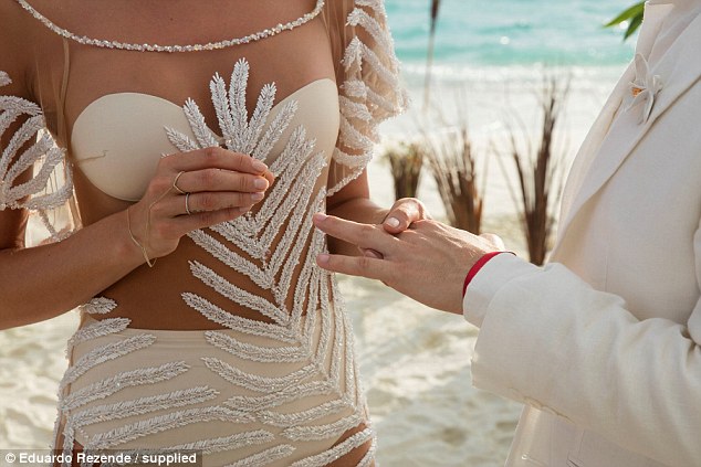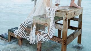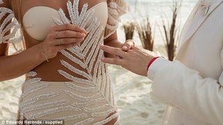 Pentru realizarea rochiei a fost nevoie de patru luni, iar designerii au folosit intre 10.000 si 30.000 de cristale, relateaza Daily Mail. In afara de o pereche de cercei cu diamante si o bratara delicata, mireasa nu a avut niciun alt accesoriu in afata de inelul de logodna. Ea a pasit desculta pe plaja, avand un buchet de crini albi.
