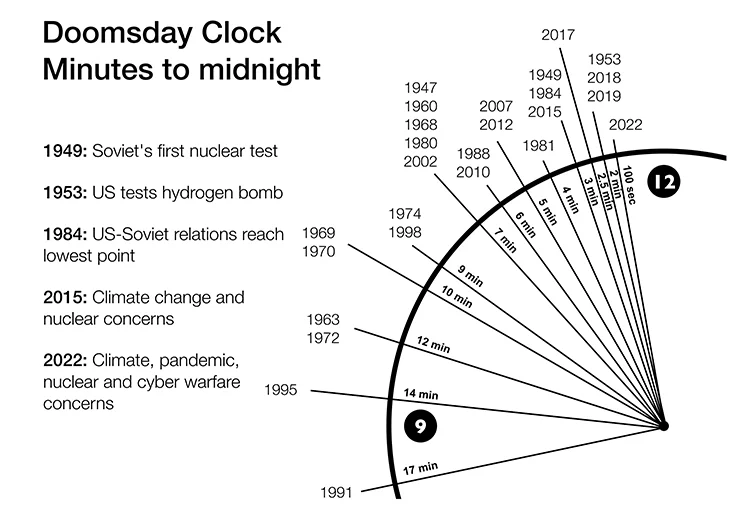 Miezul nopții de la Ceasul Apocalipsei înseamnă război nuclear și asta înseamnă extincție în masă pentru omenire.