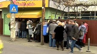 "Cati ati luat? Trei. Trei, pentru familie. Si cat ati sta la coada? De la 11 si 5. Trei ore, trei ore, chiar. Si merita? Merita, sunt foarte buni."