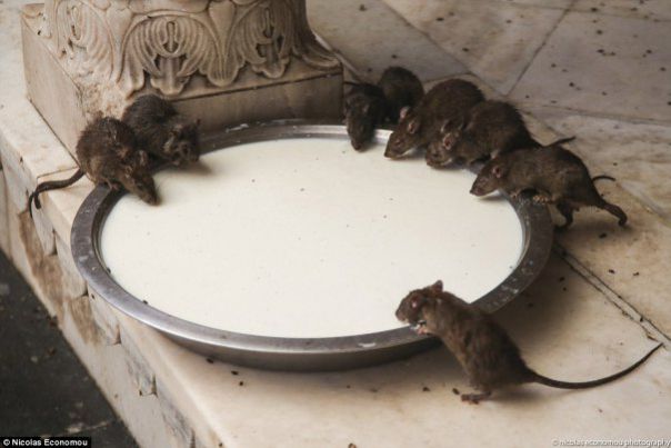 Printre miile de sobolani din templu, exista si câtiva albi, considerati o binecuvantare, de aceea vizitatorii sunt incurajati sa ii hraneasca.Fotograful Nicolas Economou din Germania a vizitat templul si a surprins sute de sobolani mâncând lapte din castroane si furisându-se printre picioarele vizitatorilor.