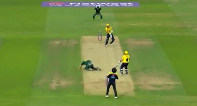 Jucatorul a aruncat mingea, iar Sam Hain a lovit-o imediat, in directia lui. Totul s-a intamplat atat de repede incat Luke Fletcher nu a avut timp sa reactioneze.