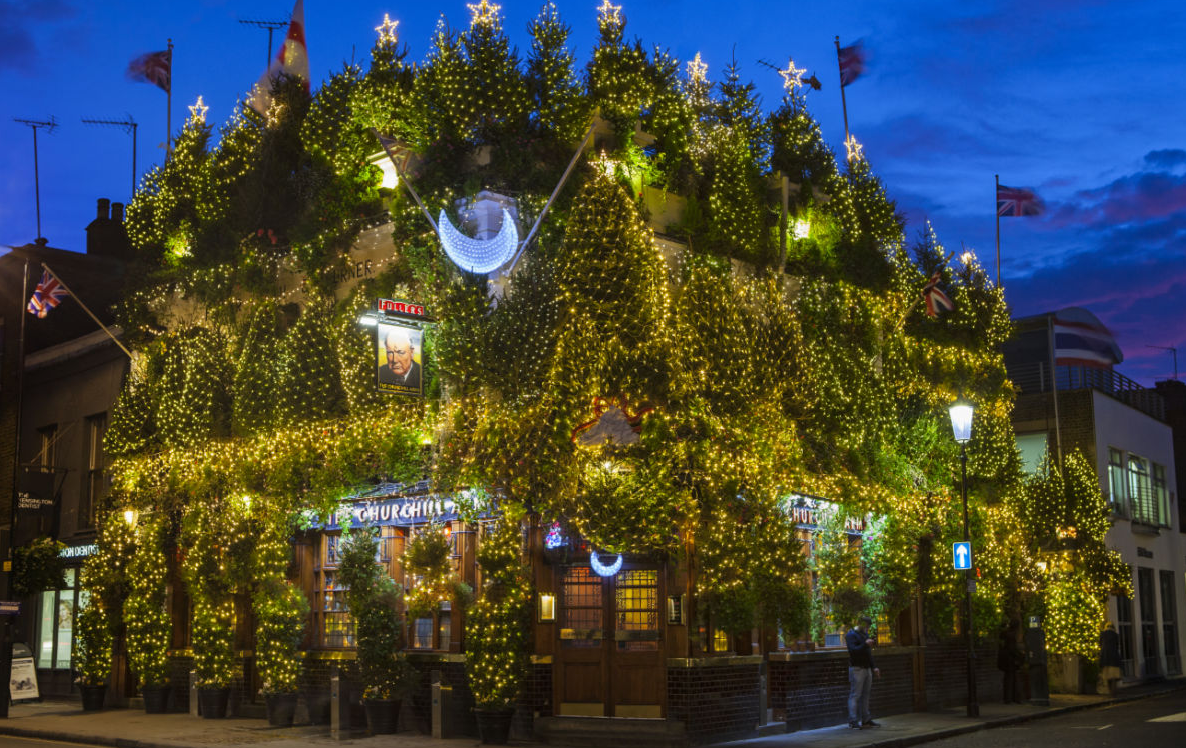 La „The Churchill Arms Pub & Restaurant”, turiștii pot admira cea mai minunată decorațiune de Crăciun. Întreaga fațadă a restaurantului este îmbrăcată în brad și plină de luminițe.