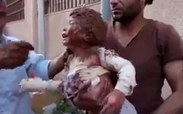 Al Jazeera a publicat imagini cumplite cu o fetita de doar cativa ani, care a cazut victima acestui atac. Micuta este tratata cu namol de catre localnici pentru a-i calma arsurile provocate de explozie.