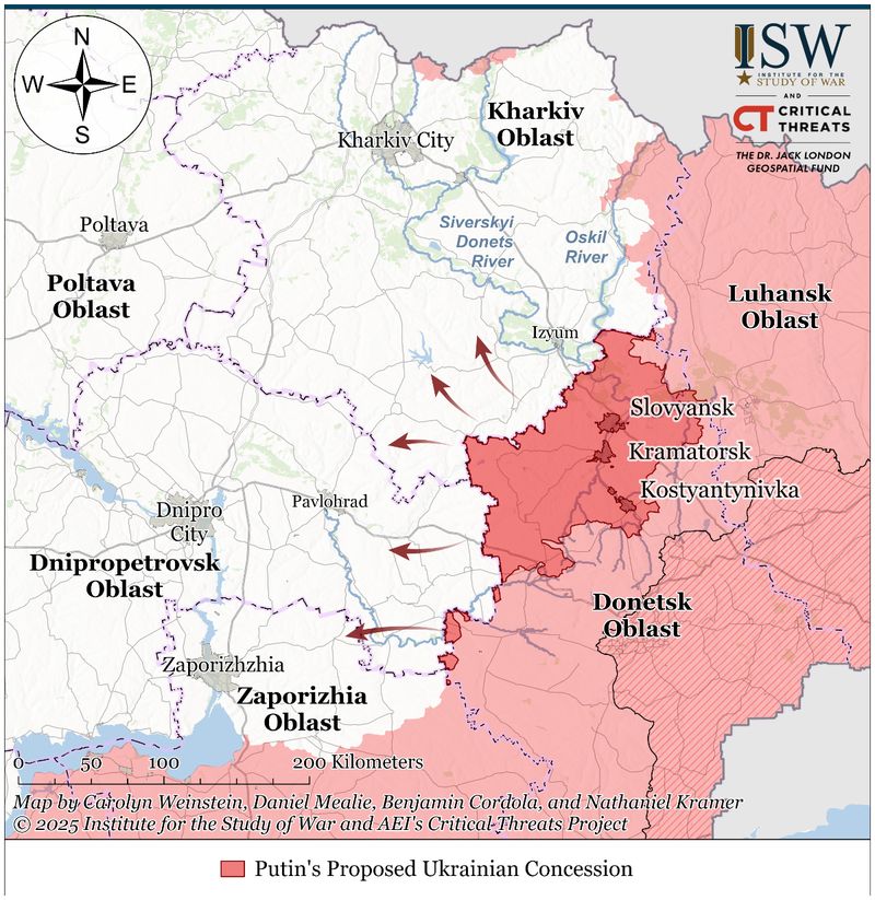 Sursele de la Kremlin au declarat că Putin a făcut compromisuri în ceea ce privește cerințele teritoriale pe care le-a prezentat în iunie 2024, care impuneau Kievului să cedeze integralitatea celor patru provincii pe care Moscova le revendică ca parte a Rusiei: Dontesk și Luhansk în estul Ucrainei- care alcătuiesc Donbasul