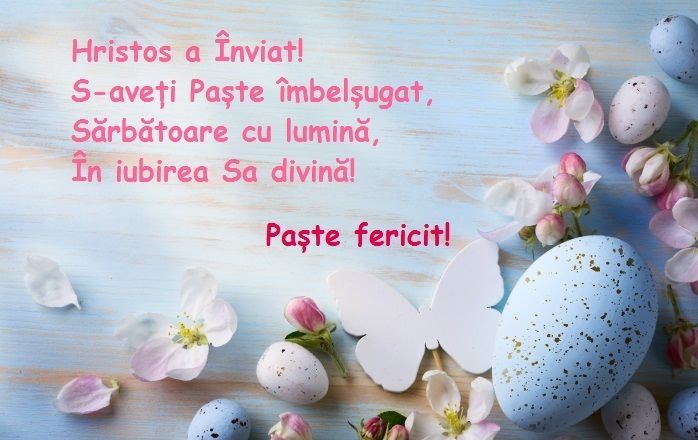 „Hristos a Înviat!Sarbatoarea Invierii Domnului,binecuvantata de lumina sfanta sa aduca sentimente calde,bogatie sufleteasca si bunastare intr-un ou inrosit de iubire si intr-un cozonac delicios precum voia buna!”