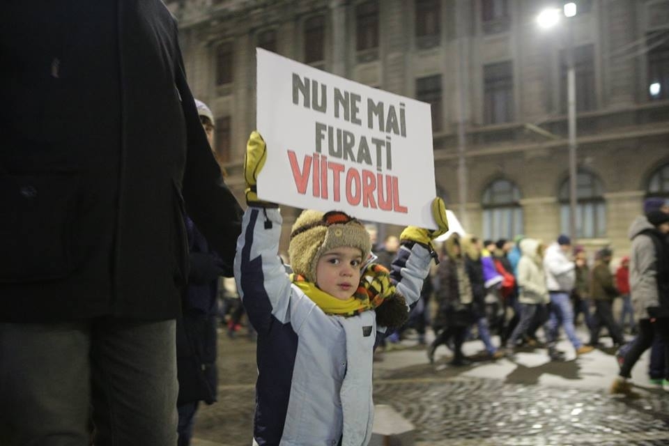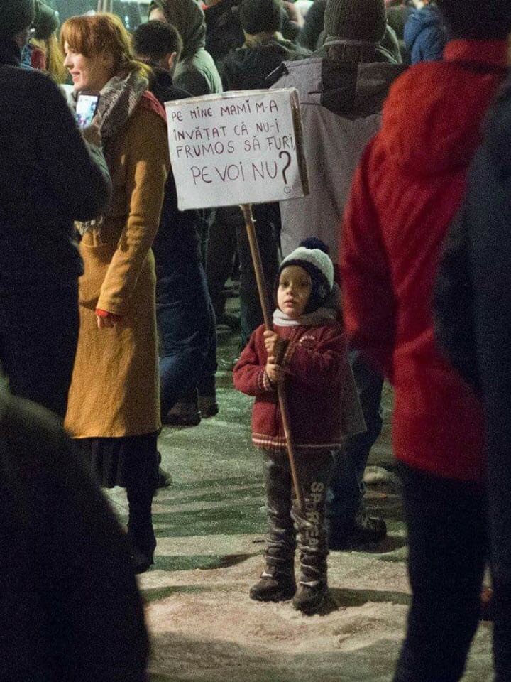Una dintre cele mai impresionante fotografii surprinse la protestul din Bucuresti arata un copil care tine in manute o pancarta pe care scrie: "Pe mine mami m-a invatat ca nu-i frumos sa furi. Pe voi nu?". Desi abia se vede in multime, pare ca si-a luat rolul in serios.