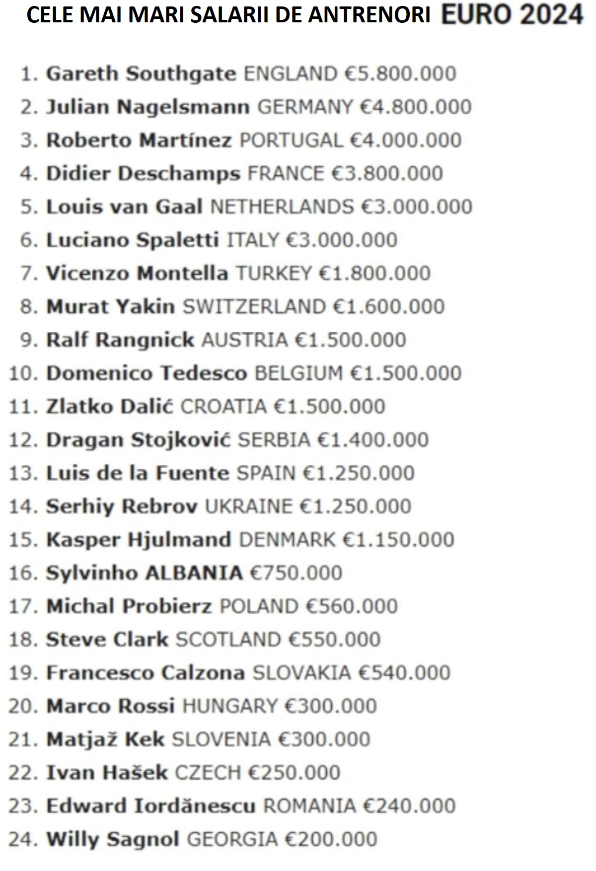 Potrivit sursei citate, Edi Iordănescu este plătit de FRF cu 240 de mii de euro anual, ceea ce-l plasează pe locul 23 din 24 în topul salariilor selecționerilor de la EURO 2024.