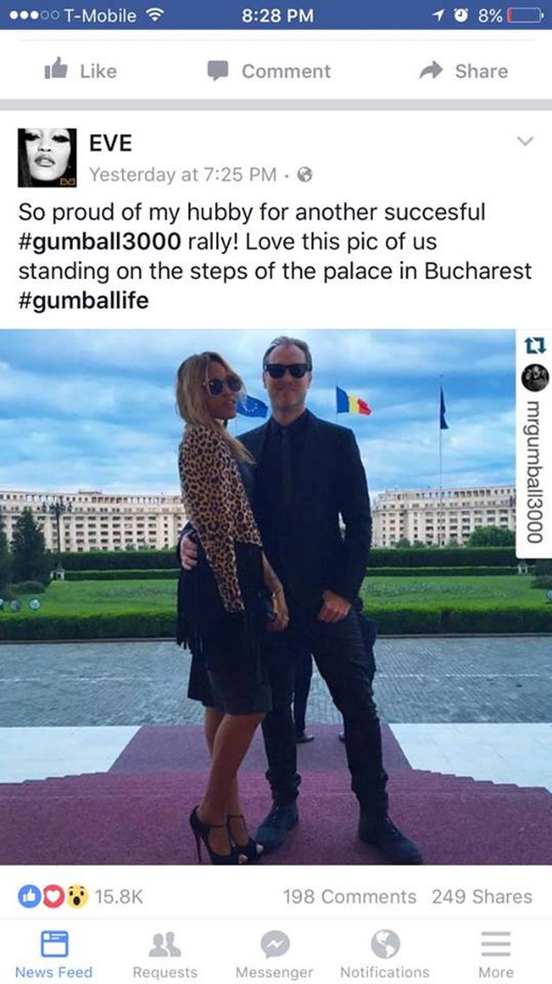 „Sunt foarte mandra de sotul meu, pentru inca un succes Gumball 3000. Iubesc fotografia aceasta cu noi pe treptele palatului din Bucuresti”, a scris Eve pe contul ei de socializare.